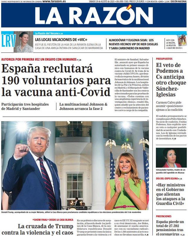 LA RAZÓN: "España reclutará 190 voluntarios para la vacuna anti-Covid"; "La cruzada de Trump contra la violencia y el caos"; "El veto de Podemos a Cs anticipa otro choque Sánchez-Iglesias"; ""Hay ministros en el Gobierno que alientan los ataques a la Guardia Civil""; "España pierde un total de 27.592 pensionistas tras el coronavirus".