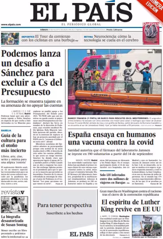 EL PAÍS: "Podemos lanza un desafío a Sánchez para excluir a Cs del Presupuesto"; "España ensaya en humanos una vacuna contra la covid"; "Guía de la cultura para el otoño más incierto Libros, arte, cine, series y música para una atípica 'rentrée'"; "El espíritu de Luther King revive en EEUU. Gran marcha en Washington contra el racismo tras el cierre de la convención republicana".