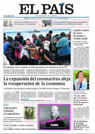 EL PAÍS: "El aumento de la tensión en Siria presiona a las fronteras de la UE"; "La expansión del coronavirus aleja la recuperación de la economía. Las Bolsas cierran una semana negra y la OMS eleva el riesgo a "muy alto""; "España reabre la venta de armas a Arabia Saudí"; "Juan M. Moreno, presidente de Andalucía: "No me gusta que Vox crezca, porque lo hace a costa de nuestro electorado""; "Ola de dimisiones en el Colegio de Arquitectos de Madrid tras el 'caso Monasterio'".