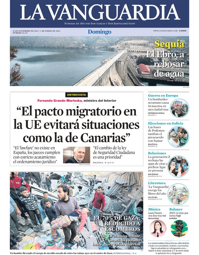 LA VANGUARDIA: "El pacto migratorio en la UE evitará situaciones como la de Canarias"; "El 70% de Gaza, reducido a escombros"; "Un bombardeo ucraniano causa 14 muertos en una ciudad rusa"; "Las bases de Podemos tumban el preacuerdo con Sumar"; "La generación Z rechaza las apps de citas y prefiere ligar en persona".
