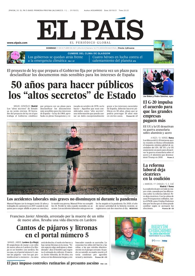 EL PAÍS: "50 años para hacer públicos los altos secretos de Estado"; "El G-20 impulsa el acuerdo para que las grandes empresas paguen"; "La reforma laboral deja cicatrices en la coalición"; "Canto de pájaros y litronas en el portal número 5".