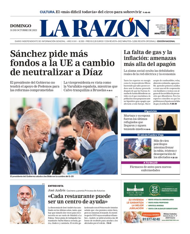 LA RAZÓN: "Sánchez pide más fondos a la UE a cambio de neutralizar a Díaz"; "La falta de gas y la inflación: amenazas más allá del apagón"; "Más de cien psicólogos intentan frenar la rabia, tristeza y desesperación de los afectados".