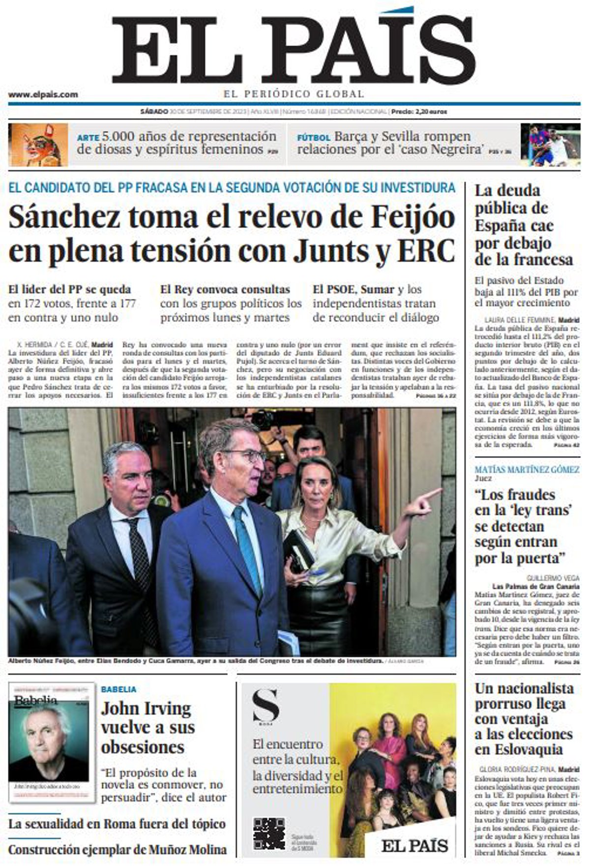 EL PAÍS: "Sánchez toma el relevo de Feijóo en plena tensión con Junts y ERC"; "La deuda pública de España cae por debajo de la francesa"; ""Los fraudes en la 'ley trans' se detectan según entran por la puerta""; "Un nacionalista prorruso llega con ventaja a las elecciones en Eslovaquia".