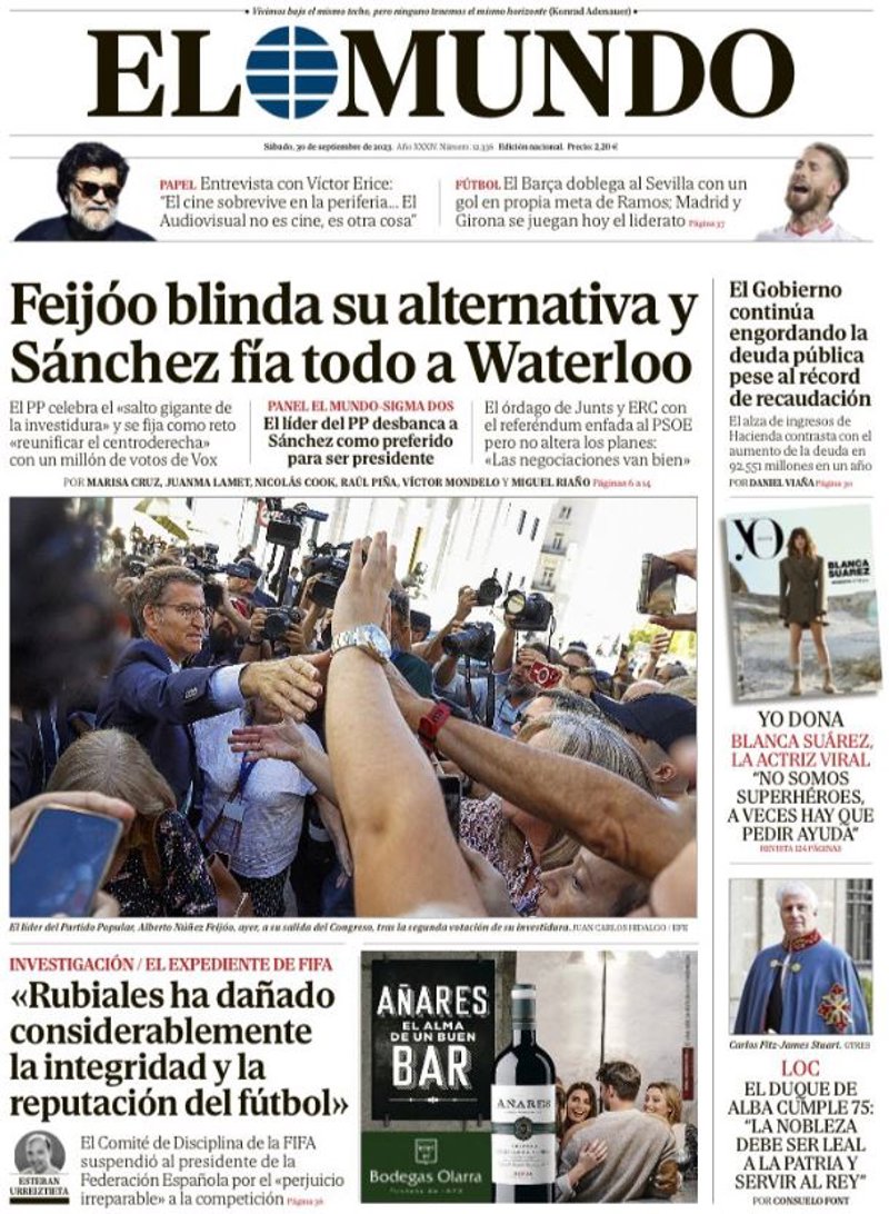 EL MUNDO: "Feijóo blinda su alternativa y Sánchez fía todo a Waterloo"; ""Rubiales ha dañado considerablemente la integridad y la reputación del fútbol""; "El Gobierno continúa engordando la deuda pública pese al récord de recaudación".