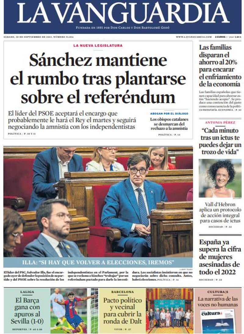 LA VANGUARDIA: "Sánchez mantiene el rumbo tras plantarse sobre el referéndum"; "Las familias disparan el ahorro al 20% para encarar el enfriamiento de la economía"; """Cada minuto tras un ictus te puedes dejar un trozo de vida""; "España ya supera la cifra de mujere asesinadas de todo el 2022".