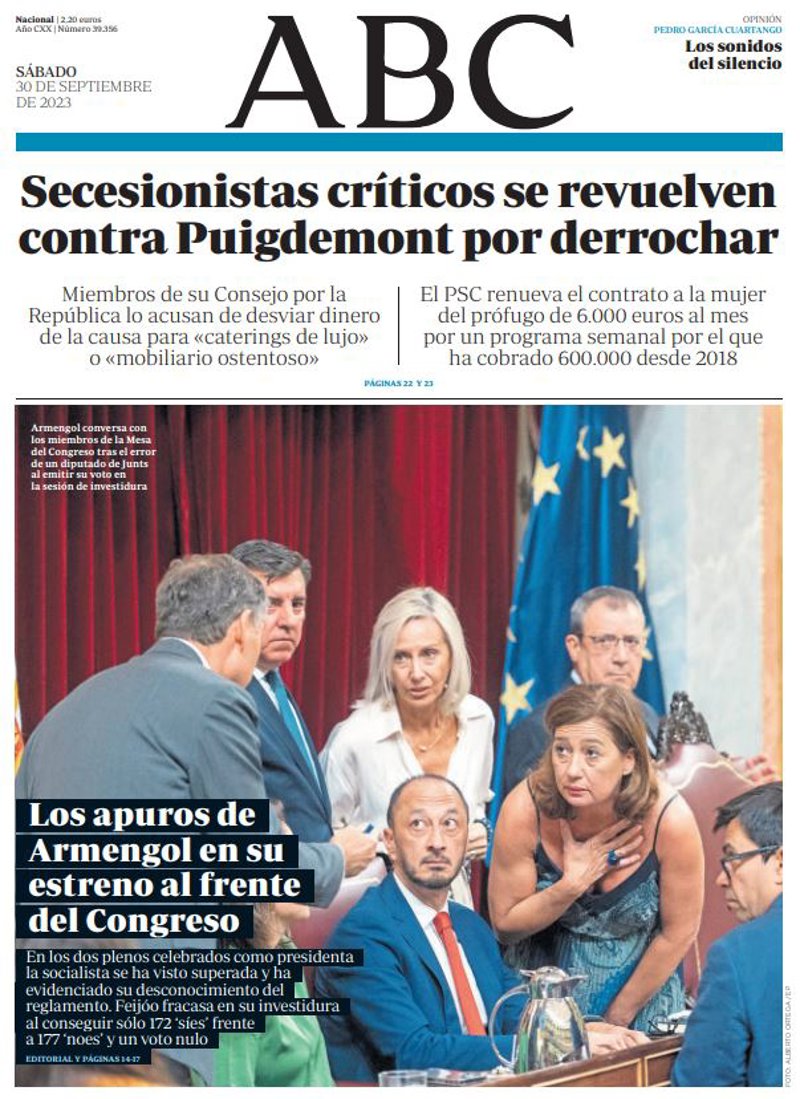 ABC: "Secesionistas críticos se revuelven contra Puigdemont por derrochar"; "Los apuros de Armengol en su estreno al frente del Congreso".