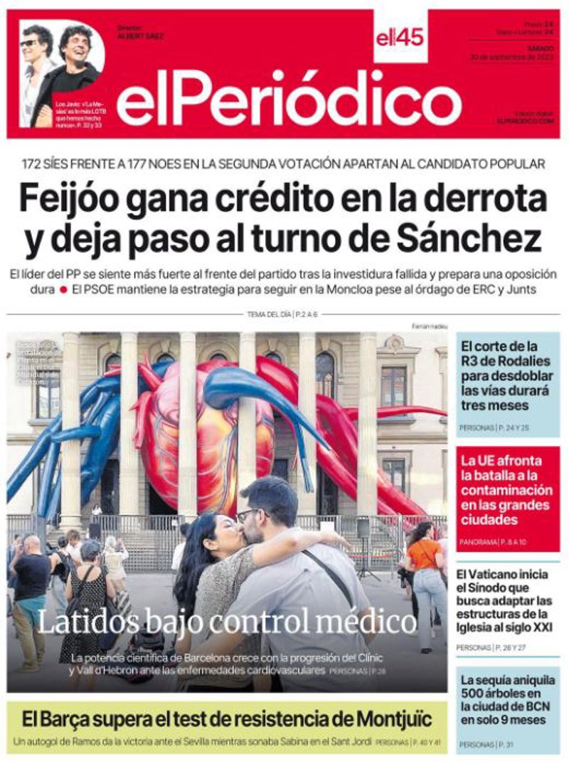 EL PERIÓDICO: "Feijóo gana crédito en la derrota y deja paso al turno de Sánchez"; "El Barça supera el test de resistencia de Montjuïc"; "El corte de la R3 de Rodalies para desdoblar las vías durará tres meses"; "La UE afronta la batalla a la contaminación en las grandes ciudades"; "El Vaticano inicia el Sínodo que busca adaptar las estructuras de la Iglesia al siglo XXI"; "La sequía aniquila 500 árboles en la ciudad de BCN en solo 9 meses".