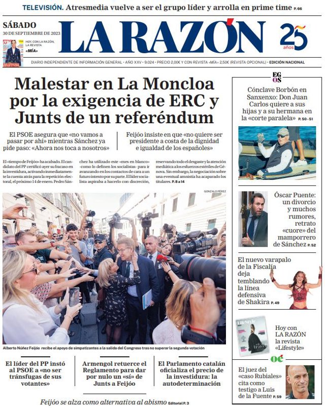 LA RAZÓN: "Malestar en La Moncloa por la exigencia de ERC y Junts de un referéndum".