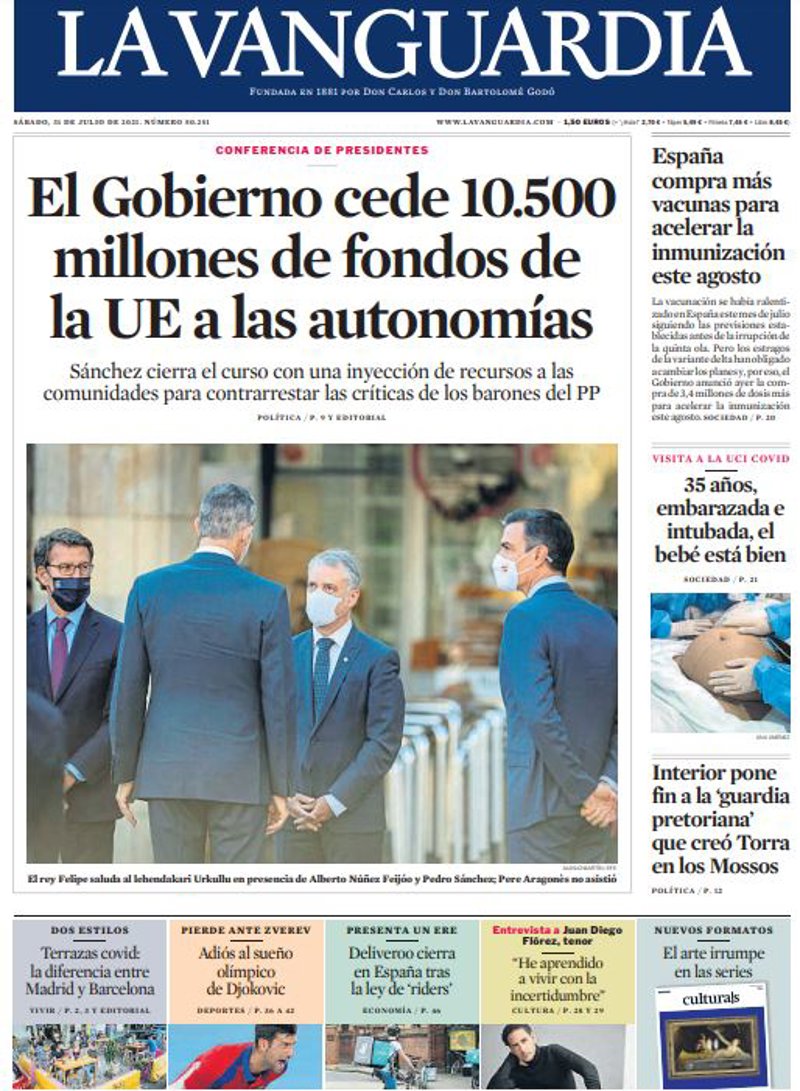 LA VANGUARDIA: "El Gobierno cede 10.500 millones de fondos de la UE a las autonomías"; "España compra más vacunas para acelerar la inmunización este agosto"; "35 años, embarazada e intubada, el bebé está bien"; "Interior pone fin a la 'guardia pretoriana' que creó Torra en los Mossos".