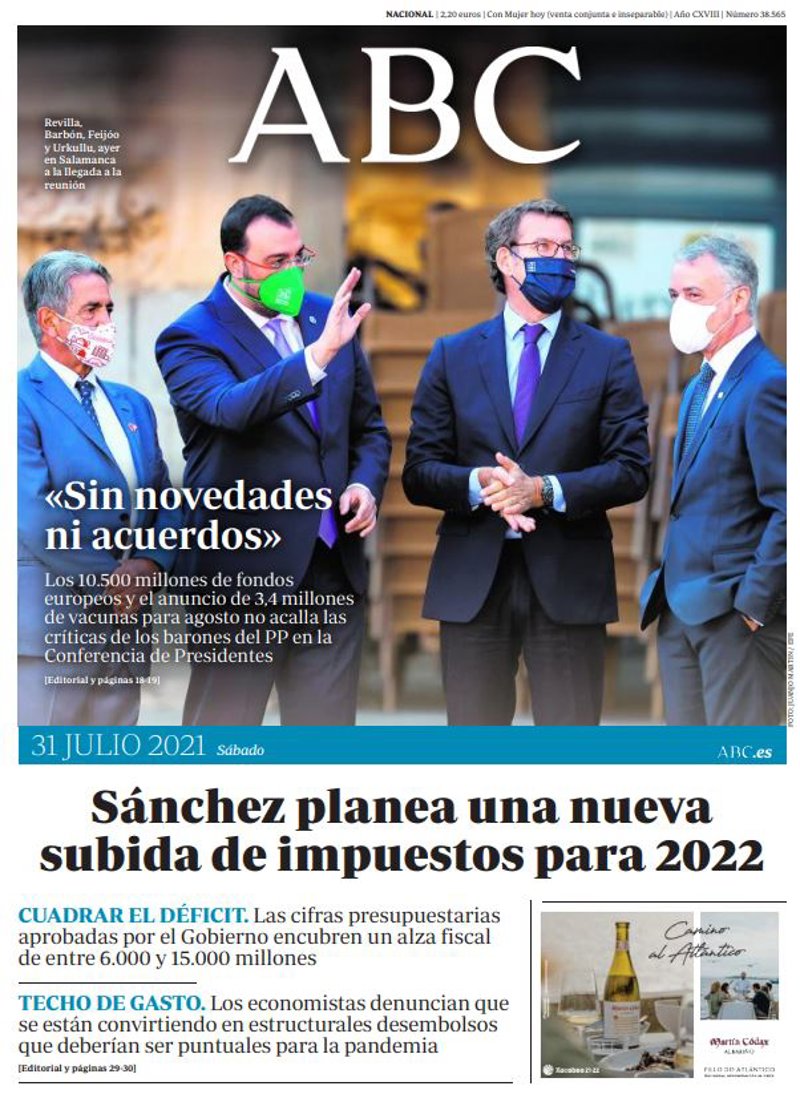 ABC: ""Sin novedades ni acuerdos". Los 10.500 millones de fondos europeos y el anuncio de 3,4 millones de vacunas para agosto no acalla las críticas de los barones del PP en la Conferencia de Presidentes"; "Sánchez planea una nueva subida de impuestos para 2022. Las cifras presupuestarias aprobadas por el Gobierno encubren un alza fiscal de entre 6.000 y 15.000 millones. Los economistas denuncian que se están convirtiendo en estructurales desembolsos que deberían ser puntuales para la pandemia".