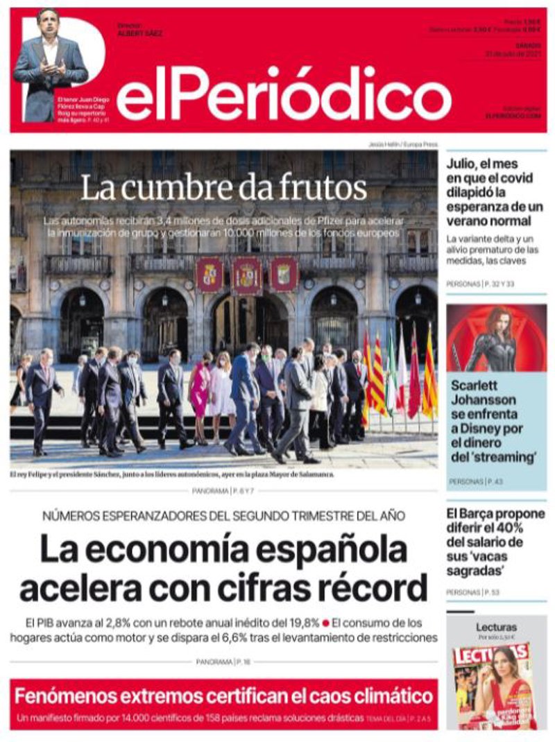 EL PERIÓDICO: "La cumbre da frutos"; "La economía española acelera con cifras récord"; "Julio, el mes en que el covid dilapido la esperanza de un verano normal"; "Scarlett Johansson se enfrenta a Disney por el dinero del 'streaming'"; "El Barça propone diferir el 40% del salario de sus 'vacas sagradas'".