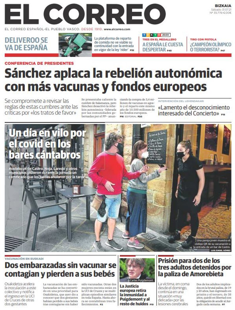EL CORREO: "Sánchez aplaca la rebelión autonómica con más vacunas y fondos europeos"; "Un día en vilo por el covid en los bares cántabros"; "Dos embarazadas sin vacunar se contagian y pierden a sus bebés"; "La Justicia europea retira la inmunidad a Puigdemont y al resto de huidos"; "Prisión para dos de los tres adultos detenidos por