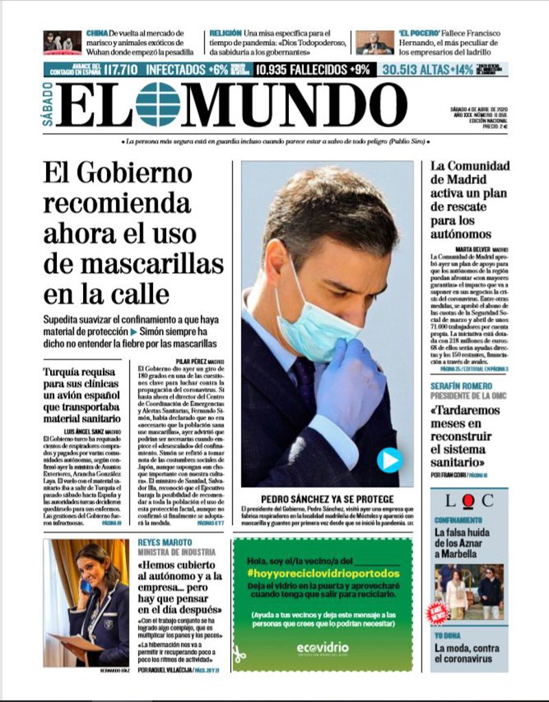 EL MUNDO: "El Gobierno recomienda ahora el uso de mascarillas en la calle"; "Pedro Sánchez se protege. El presidente del Gobierno, Pedro Sánchez, visitó ayer una empresa que fabrica respiradores en la localidad madrileña de Móstoles y apareció con mascarilla y guantes por primera vez desde que se inició la pandemia"; "La Comunidad de Madrid activa un plan de rescate para los autónomos"; "Serafín Romero, presidente de la OMC: "Tardaremos meses en reconstruir el sistema sanitario"; "Reyes Maroto, ministra de Industria: "Hemos cubierto al autónomo y a la empresa... pero hay que pensar en el día después"".