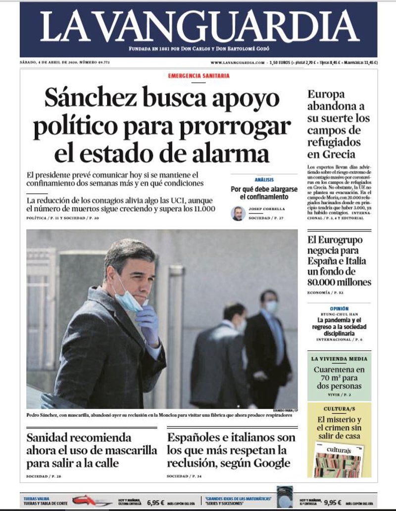 LA VANGUARDIA: "Sánchez busca apoyo político para prorrogar el estado de alarma"; "Sanidad recomienda ahora el uso de mascarilla para salir a la calle"; "Españoles e italianos son los que más respetan la reclusión, según Google"; "Europa abandona a su suerte los campos de refugiados en Grecia"; "El Eurogrupo negocia para España e Italia un fondo de 80.000 millones".