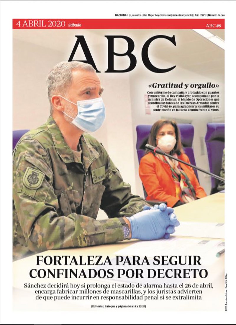 ABC: "Fortaleza para seguir confinados por decreto. Sánchez decidirá hoy si prolonga el estado de alarma hasta el 26 de abril, encarga fabricar millones de mascarillas, y los juristas advierten de que puede incurrir en responsabilidad penal si se extralimita".