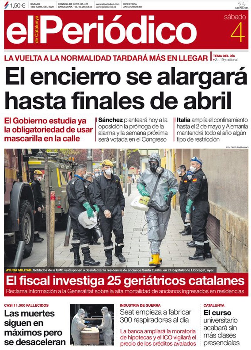 EL PERIÓDICO: "El encierro se alargará hasta finales de abril. El Gobierno estudia ya la obligatoriedad de usar mascarillas en la calle"; "El fiscal investiga 25 geriátricos catalanes"; "Las muertes siguen en máximos pero se desaceleran"; "Seat empieza a fabricar 300 respiradores al día"; "El curso universitario acabará sin clases presenciales".