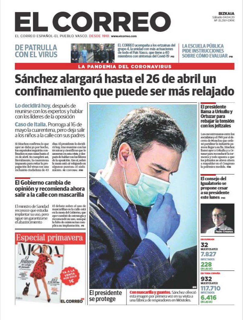 EL CORREO: "Sánchez alargará hasta el 26 de abril un confinamiento que puede ser más relajado"; "El presidente se protege. Con mascarilla y guantes. Sánchez ofreció esta imagen por primera vez en su visita a una fábrica de respiradores en Móstoles"; "El Gobierno cambia de opinión y recomienda ahora salir a la calle con mascarilla"; "El presidente llama a Urkullu y Ortuzar para rebajar la tensión con los jeltzales"; "El consejo del Igualatorio se propone cesar a su presidente este lunes".