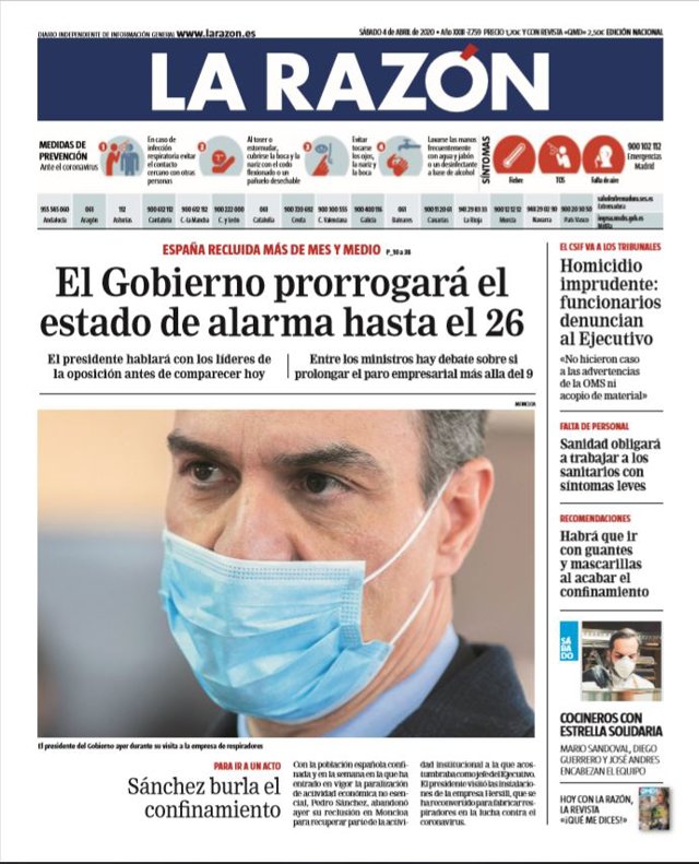 LA RAZÓN: "El Gobierno prorrogará el estado de alarma hasta el 26"; "Sánchez burla el confinamiento"; "Homicidio imprudente: funcionarios denuncian al Ejecutivo"; "Sanidad obligará a trabajar a los sanitarios con síntomas leves"; "Habrá que ir con guantes y mascarillas al acabar el confinamiento".