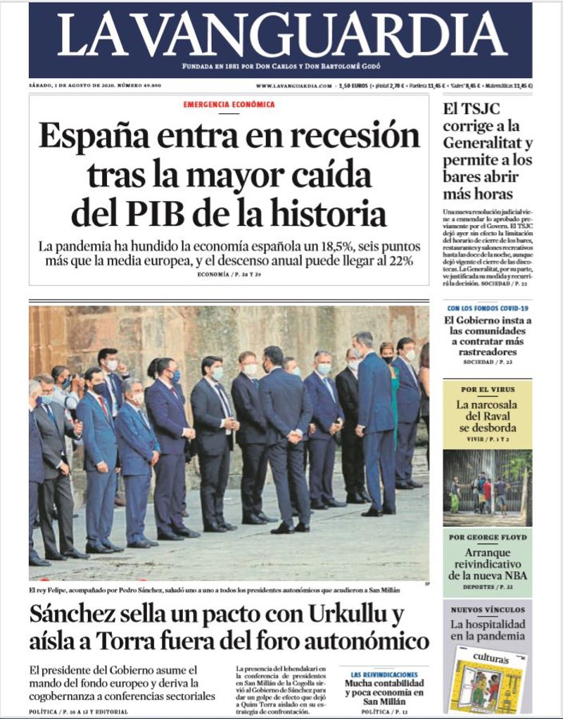 LA VANGUARDIA: "España entra en recesión tras la mayor caída del PIB de la historia"; "Sánchez sella un pacto con Urkullu y aísla a Torra fuera del foro autonómico. Mucha contabilidad y poca economía en San Millán"; "El TSJC corrige a la Generalitat y permite a los bares abrir más horas"; "El Gobierno insta a las comunidades a contratar más rastreadores".