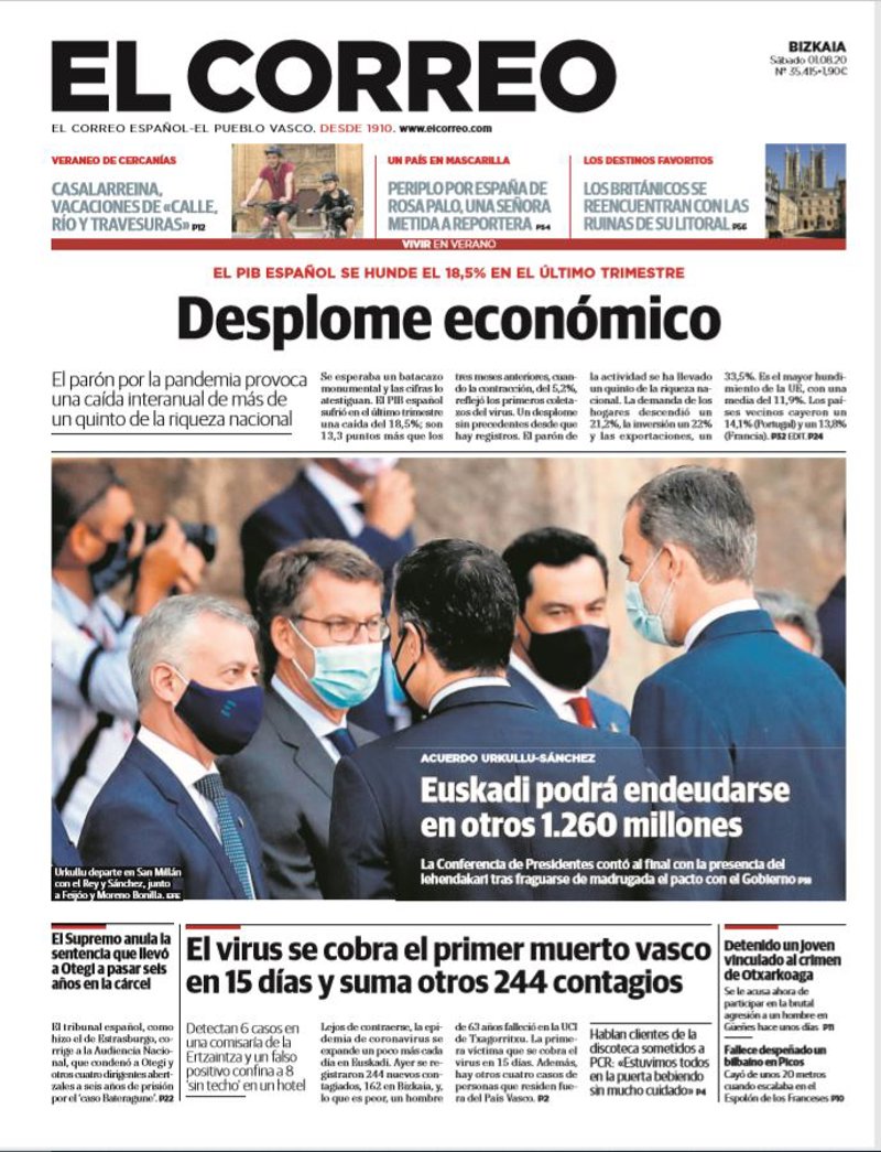 EL CORREO: "Desplome económico. El PIB español se hunde el 18,5% en el último trimestre"; "Euskadi podrá endeudarse en otros 1.260 millones"; "El virus se cobra el primer muerto vasco en 15 días y suma otros 244 contagios".