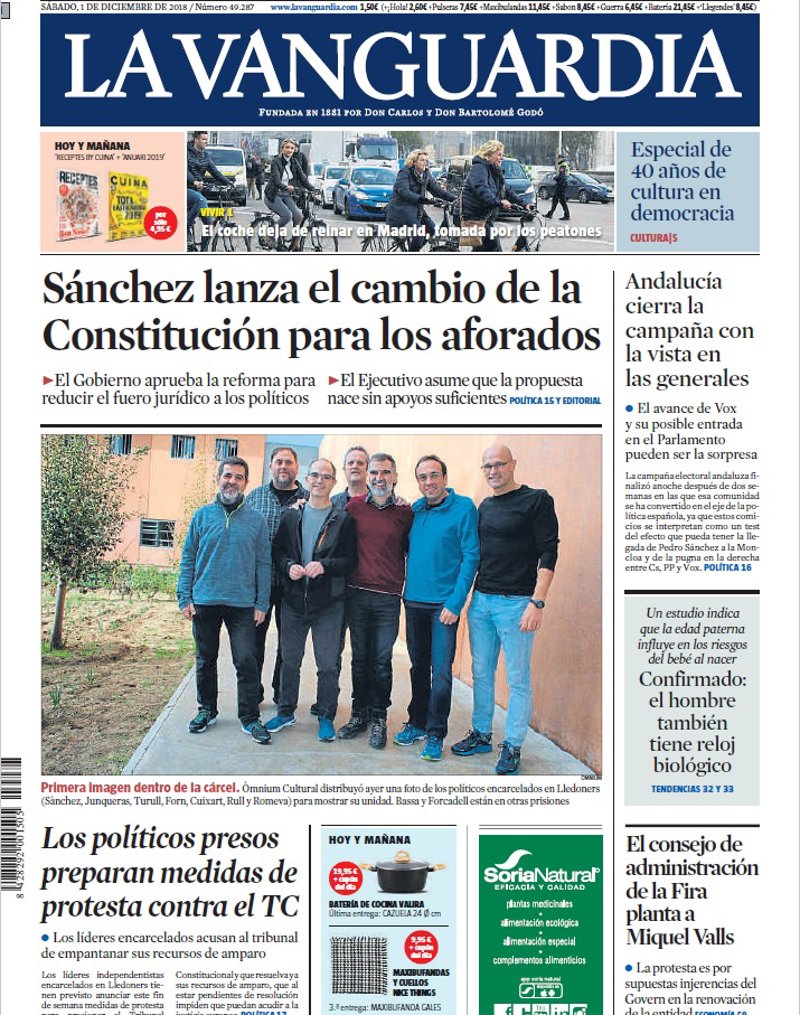 LA VANGUARDIA: "Sánchez lanza el cambio de la Constitución para los aforados"; "Los políticos presos preparan medidas de protesta contra el TC"; "Andalucía cierra la campaña con la vista en las generales"; "Confirmado: el hombre también tiene reloj biológico"; "El consejo de administración de la Fira planta a Miquel Valls".