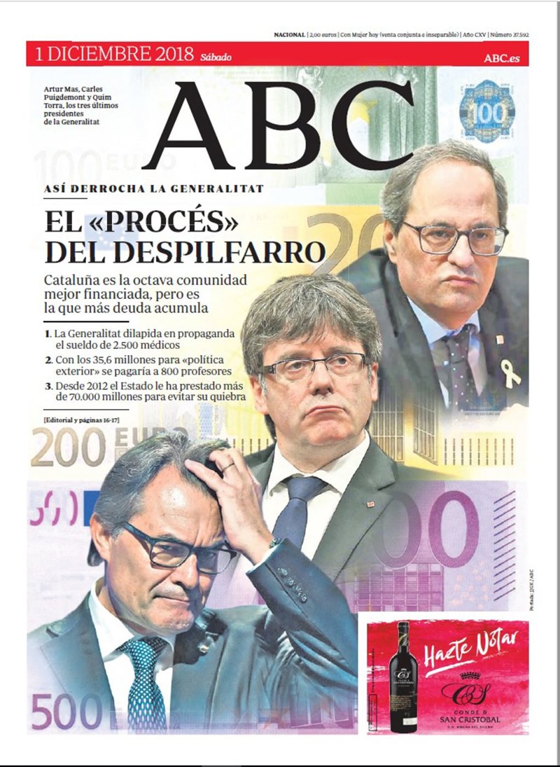 ABC: "El "procés" del despilfarro. Cataluña es la octava comunidad mejor financiada, pero es la que más deuda acumula".