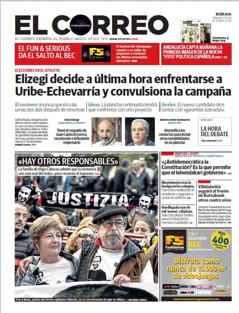 EL CORREO: "Elizegi decide a última hora enfrentarse a Uribe-Echevarría y convulsiona la campaña"; ""Hay otros responsables". La familia de Íñigo Cabacas admite que la sentencia "no está mal del todo", pero recurrirá al Supremo"; "Meritxell Batet: "¿Antidemocrática la Constitución? Es la que permite que el lehendakari gobierno"".