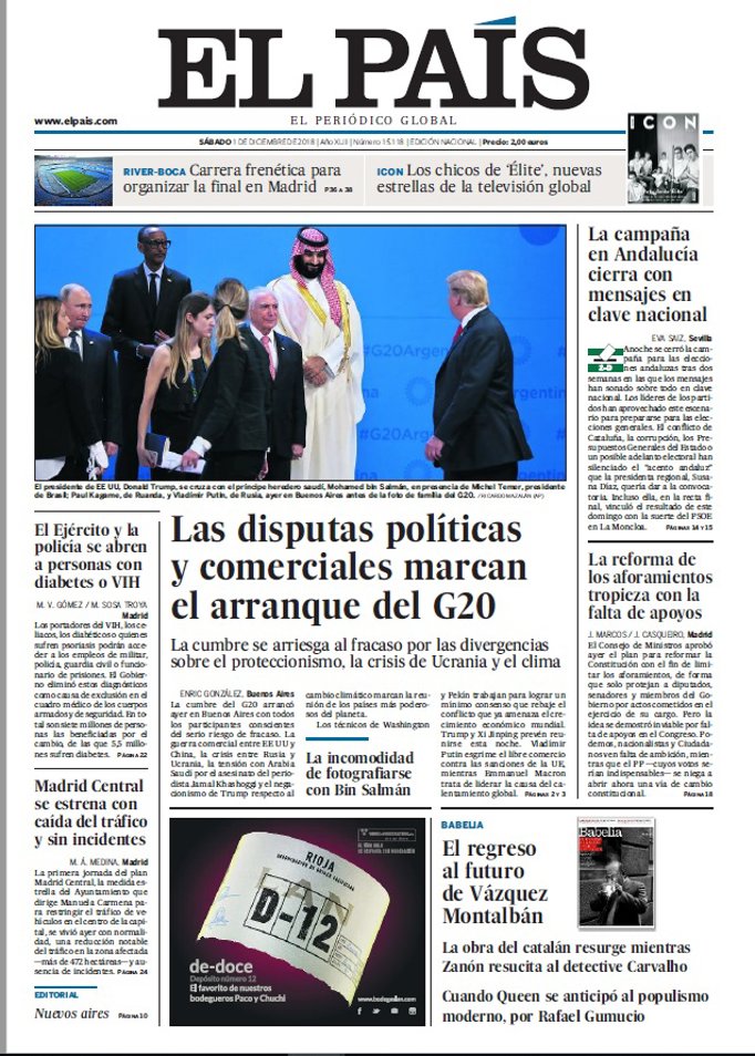 EL PAÍS: "Las disputas políticas y comerciales marcan el arranque del G20. La incomodidad de fotografiarse con Bin Salmán"; "La campaña en Andalucía cierra con mensaje en clave nacional"; "La reforma de los aforamientos tropiezan con la falta de apoyos"; "El Ejército y la policía se abren a personas con diabetes o VIH"; "Madrid Central se estrena con caída del tráfico y sin incidentes".