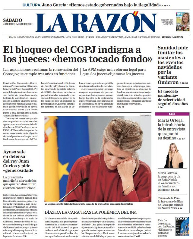 LA RAZÓN: "El bloqueo del CGPJ indigna a los jueces: "hemos tocado fondo""; "Ayuso sale en defensa del rey Juan Carlos y pide "generosidad""; "Sanidad pide limitar los asistentes a los eventos navideños por la variante Ómicron"; "El "modelo pandemia" de selectividad seguirá dos años".