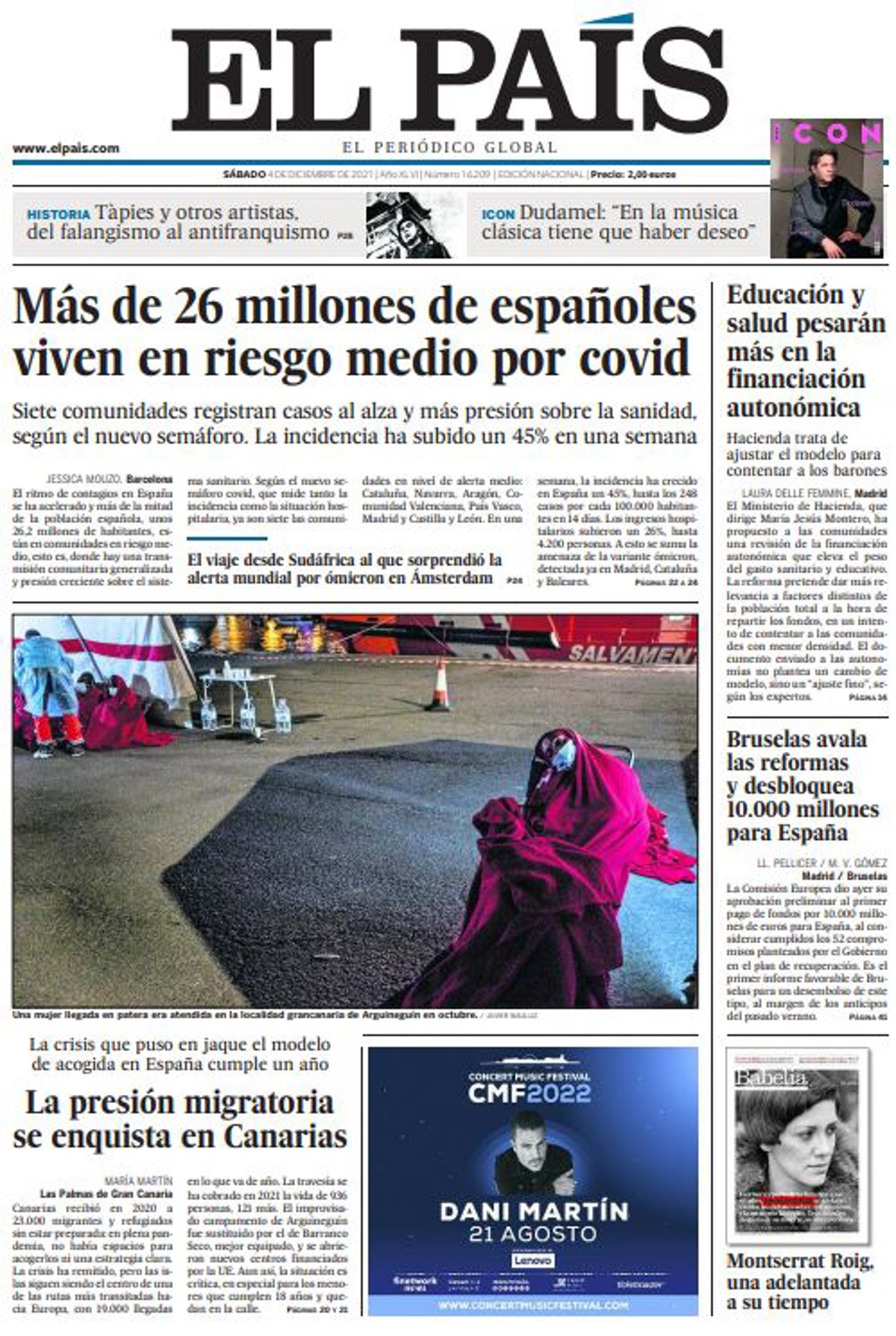 EL PAÍS: "Más de 26 millones de españoles viven en riesgo medio por covid"; "La presión migratoria se enquista en Canarias"; "Educación y salud pesarán más en la financiación autonómica"; "Bruselas avala las reformas y desbloquea 10.000 millones para España".