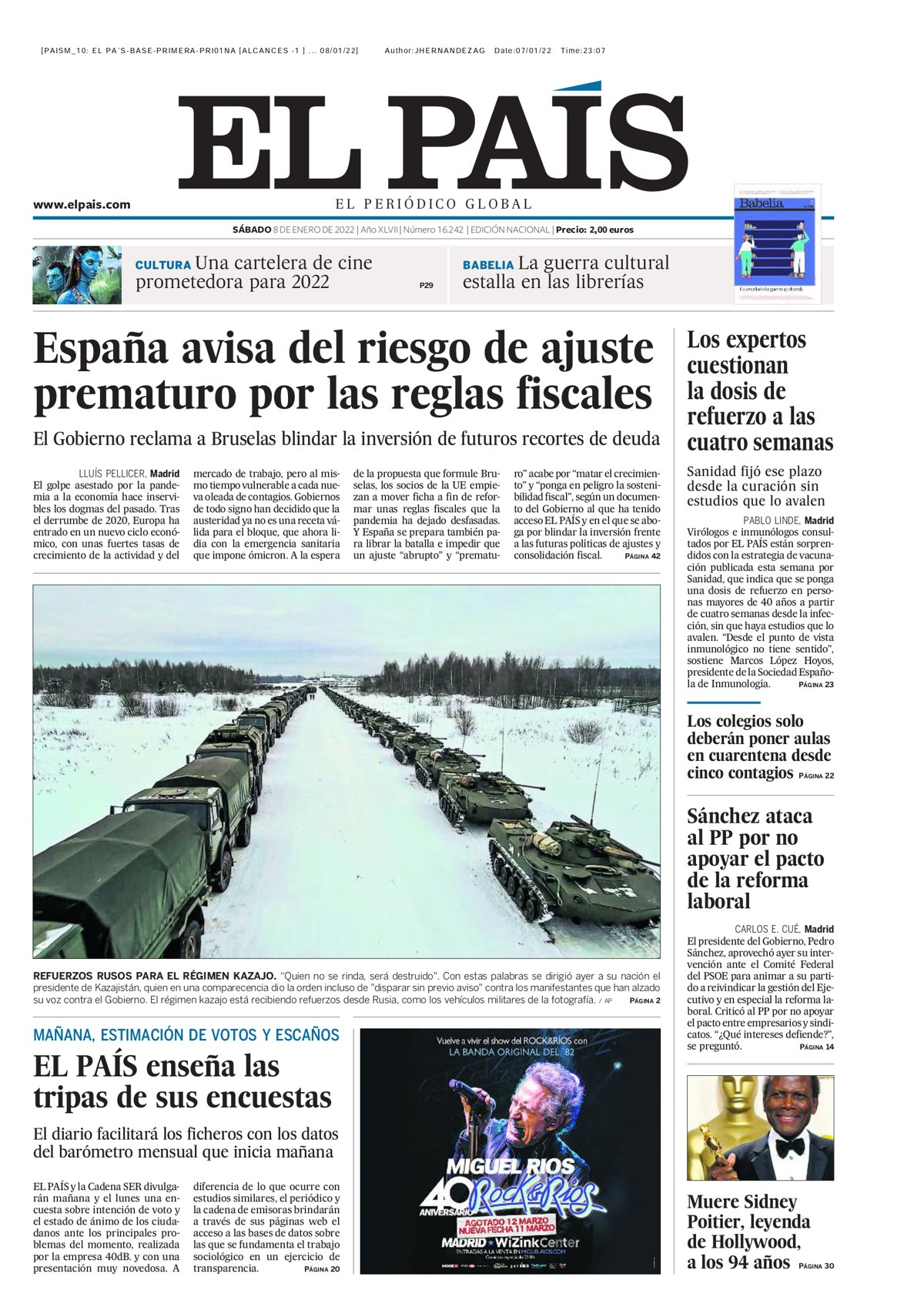 EL PAÍS: "España avisa del riesgo de ajuste prematuro por las reglas fiscales"; "El PAÍS enseña las tripas de sus encuestas"; "Los expertos cuestionan la dosis de refuerzo a las cuatro semanas"; "Sánchez ataca al PP por no apoyar el pacto de la reforma laboral"; "Muere Sideny Poitier, leyenda de Hollywood a los 94 años".