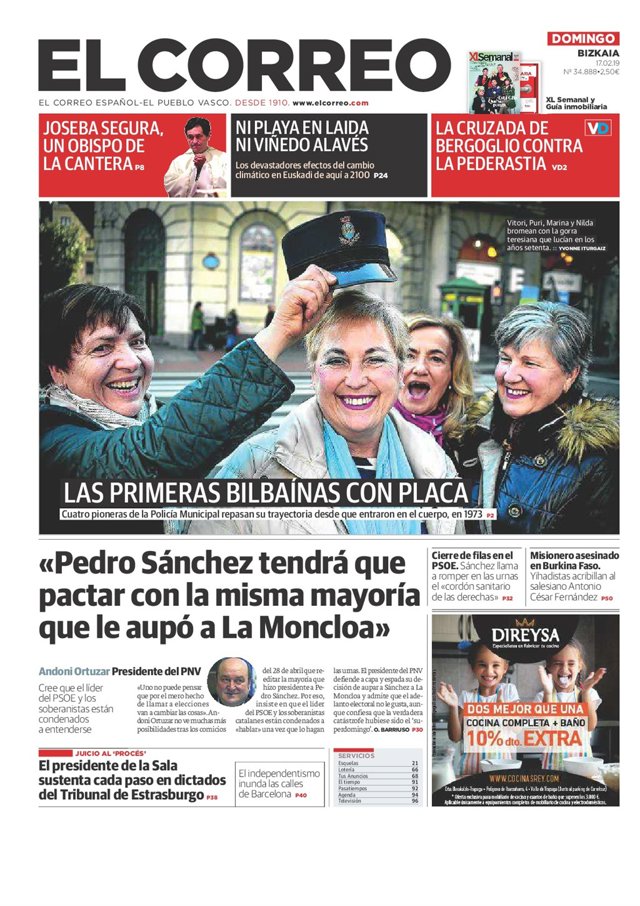 EL CORREO: El presidente del PNV, Andoni Ortuzar: "Pedro Sánchez tendrá que pactar con la misma mayoría que le aupó a La Moncloa"; Juicio al 'Procés': El presidente de la Sala sustenta cada paso en dictados del Tribunal de Estrasburgo".