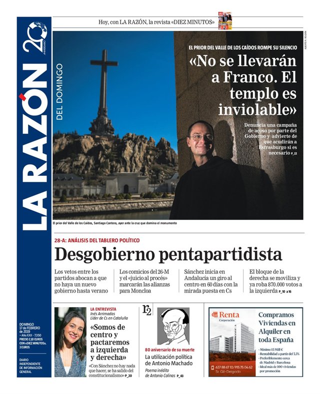 LA RAZÓN: "El prios del Valle de los Caídos rompe su silecio: No se llevarán a Franco. El templo es inviolable"; "Denuncia una campaña de acoso por parte del Gobierno y advierte de que acudirán a Estrasburgo si es necesario"; "28-A: análisis del tablero político"; "Desgobierno pentapartidista".