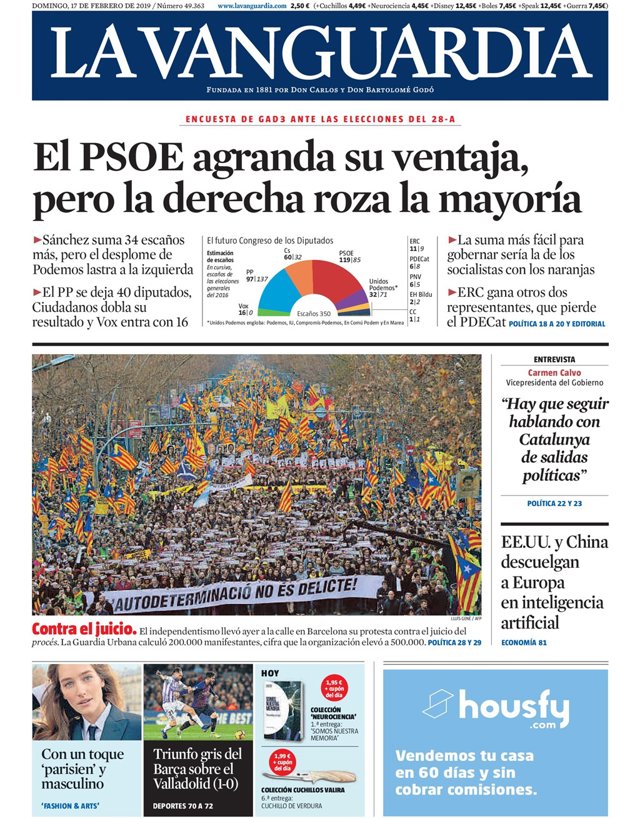EL PAÍS: "La batalla del 28-A se juega en la agenda social y Cataluña"; "Sánchez busca una masiva movilización de la izquierda para frenar a la derecha; Pablo Casado: "Hemos detenido la venta de España a los independentistas"; "El posible pacto entre Cs, PP y Vox cataliza las estrategias electorales"; "Marcha masiva en Barcelona contra el juicio del 'procés'"; El nuevo orden mundial abre una era de incertidumbre".