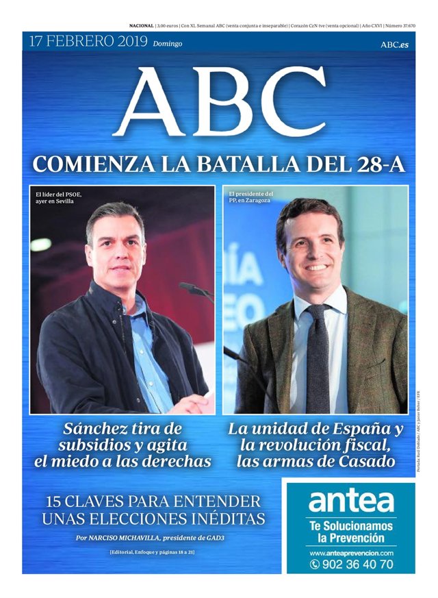 ABC: "Comienza la batalla del 28-A"; "Sánchez tira de subsidios y agita el miedo a las derechas"; "La unidad de España y la revolución fiscal, las armas de Casado"; "15 claves para entender unas elecciones inéditas".