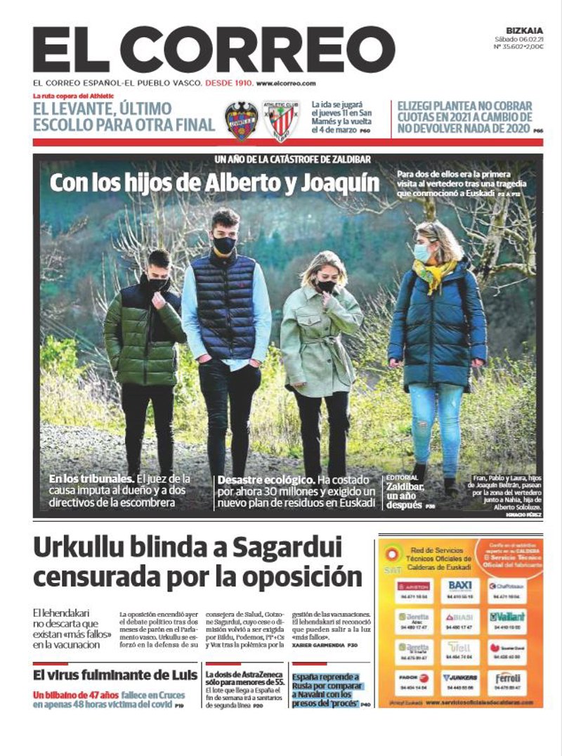 EL CORREO: "Con los hijos de Alberto y Joaquín. Un años de la catástrofe de Zaldibar. Para dos de ellos era la primera visita al vertedero tras una tragedia que conmocionó a Euskadi"; "Urkullu blinda a Sagardui censurada por la oposición"; "El virus fulminante de Luis. Un bilbaíno de 47 años fallece en Cruces en apenas 48 horas víctima del covid"; " La dosis de AstraZeneca sólo para menores de 55"; "España reprende a Rusia por comparar a Navalni con los presos del 'procés'".