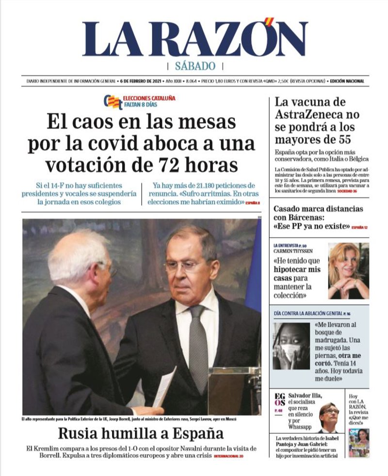 LA RAZÓN: "El caos en las mesas por la covid aboca a una votación de 72 horas"; "Rusia humilla a España. El Kremlim compara a los presos del 1-O con el opositor Navalni durante la visita de Borrell. Expulsa a tres diplomáticos europeos y abre una crisis"; "La vacuna de AstraZeneca no se pondrá a los mayores de 55"; " Casado marca distancias con Bárcenas: "Ese PP ya no existe""; "Carmen Thyssen: "He tenido que hipotecar mis casas para mantener la colección"".