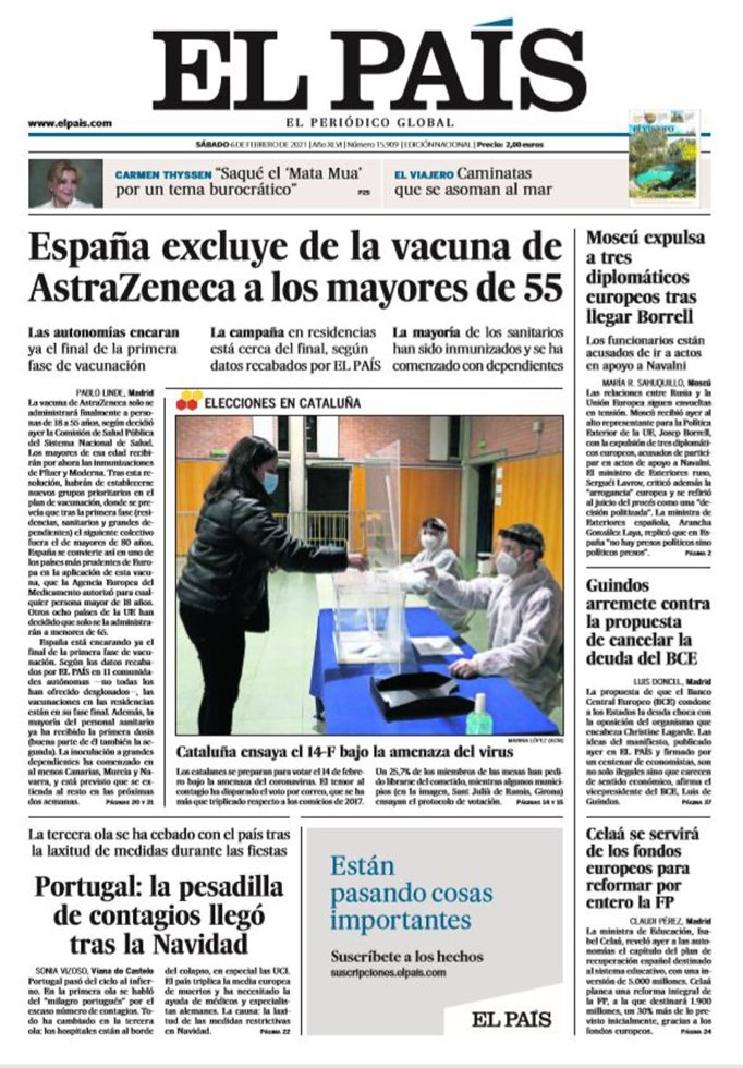 EL PAÍS: "España excluye de la vacuna de AstraZeneca a los mayores de 55"; "Cataluña ensaya el 14-F bajo la amenaza del virus"; "Portugal: la pesadilla de contagios llegó tras la Navidad"; "Moscú expulsa a tres diplomáticos europeos tras llegar Borrell"; "Guindos arremete contra la propuesta de cancelar la deuda del BCE"; "Celaá se servirá de los fondos europeos para reformar por entero la FP".