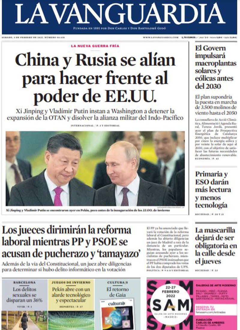 LA VANGUARDIA: "China y Rusia se alían para hacer frente al poder de EE.UU."; "Los jueces dirimirán la reforma laboral mientras PP y PSOE se acusan de pucherazo y 'tamayazo'"; "El Govern impulsará macroplantas solares y eólicas antes del 2030"; "Primaria y ESO darán más lectura y menos tecnología"; "La mascarilla dejará de ser