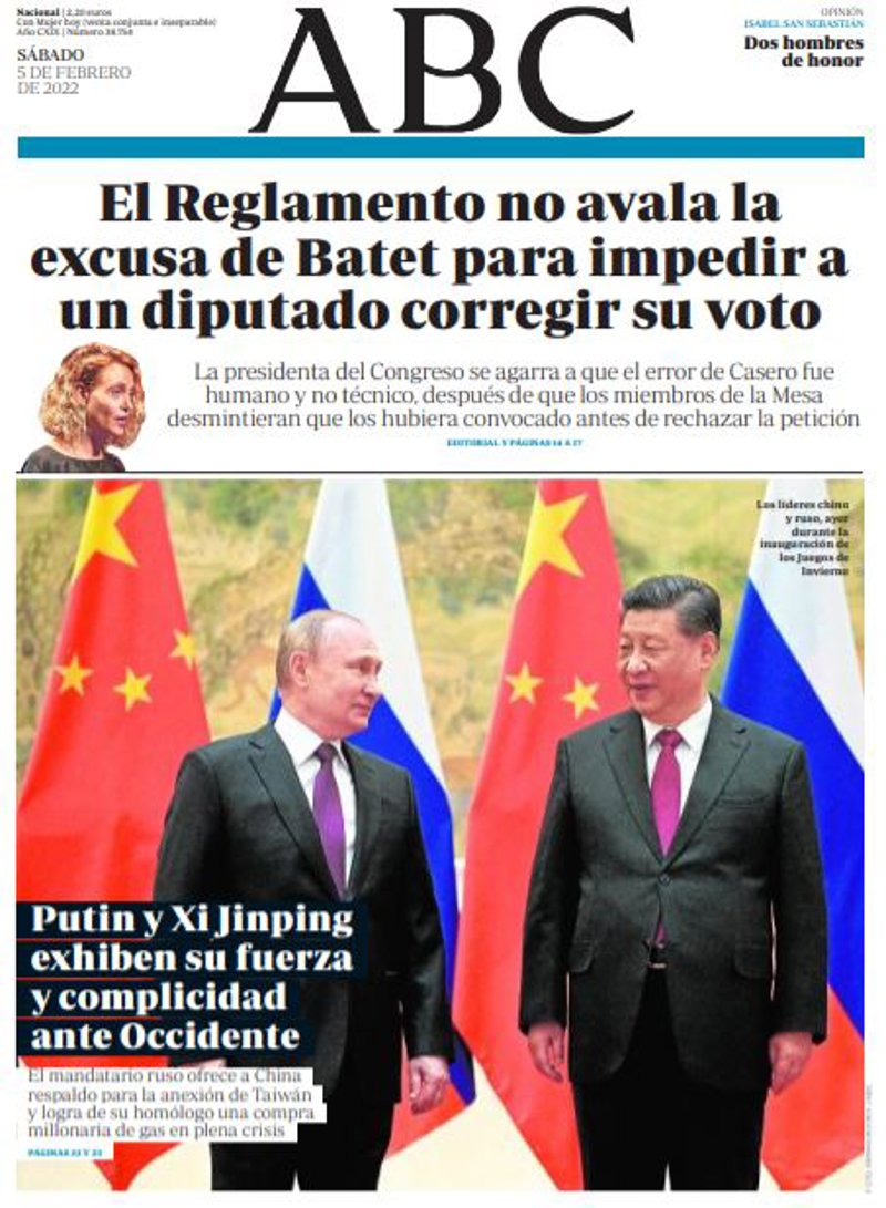 ABC: "El Reglamento no avala la excusa de Batet para impedir a un diputado corregir su voto. La presidenta del Congreso se agarra a que el error de Casero fue humano y no técnico, después de que los miembros de la Mesa desmintieran que los hubiera convocado antes de rechazar la petición"; "Putin y Xi Jinping exhiben su fuerza y complicidad ante Occidente. El mandatario ruso ofrece a China respaldo para la anexión de Taiwán y logra de su homólogo una compra millonaria de gas en plena crisis".