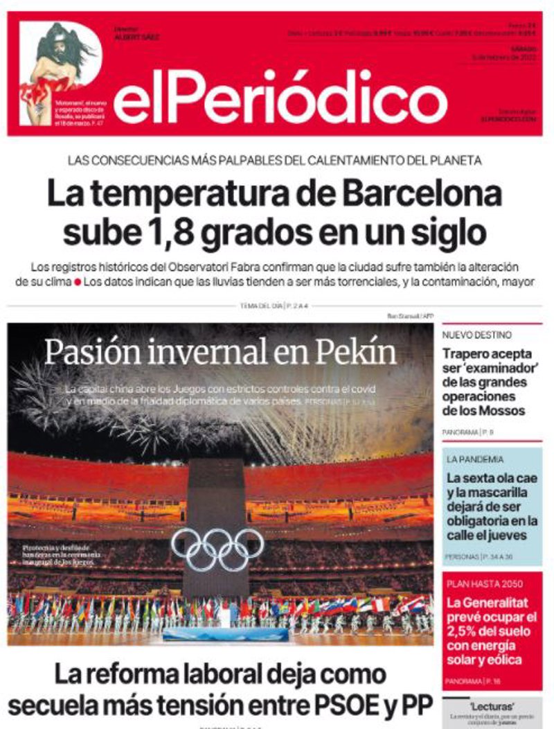 EL PERIÓDICO: "La temperatura de Barcelona sube 1,8 grados en un siglo"; "Pasión invernal en Pekín"; "La reforma laboral deja como secuela más tensión entre PSOE y PP"; "Trapero acepta ser 'examinador de las grandes operaciones de los Mossos"; "La sexta ola cae y la mascarilla dejará de ser obligatoria en la calle el jueves"; "La Generalitat prevé ocupar el 2,5% del suelo con energía solar y eólica".