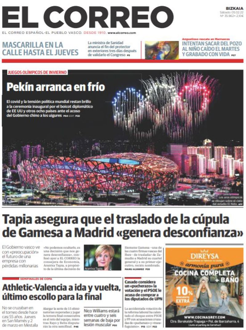 EL CORREO: "Pekín arranca en frío"; "Tapia asegura que el traslado de la cúpula de Gamesa a Madrid "genera desconfianza""; "Athletic-Valencia a ida y vuelta, último escollo para la final"; "Casado considera un "pucherazo" la votación y el PSOE le acusa de comprar a los diputados de UPN".
