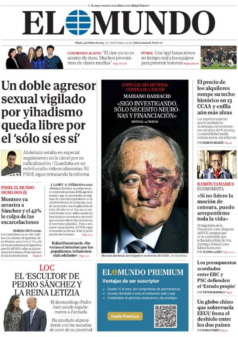 EL MUNDO: "Un doble agresor sexual vigilado por yihadismo queda libre por el 'sólo sí es sí'"; "Montero ya arrastra a Sánchez y el 42% le culpa de las excarcelaciones"; "El precio de los alquileres rompe su techo histórico en 13 CCAA y enfila aún más alzas"; "Ramón Tamanes: "Si no lidero la moción de censura, puedo arrepentirme toda la vida""; "Los presupuestos acordados entre ERC y PSC defienden el 'Estado propio'"; "Un globo chino que sobrevuela EEUU frena el deshielo entre los dos países".