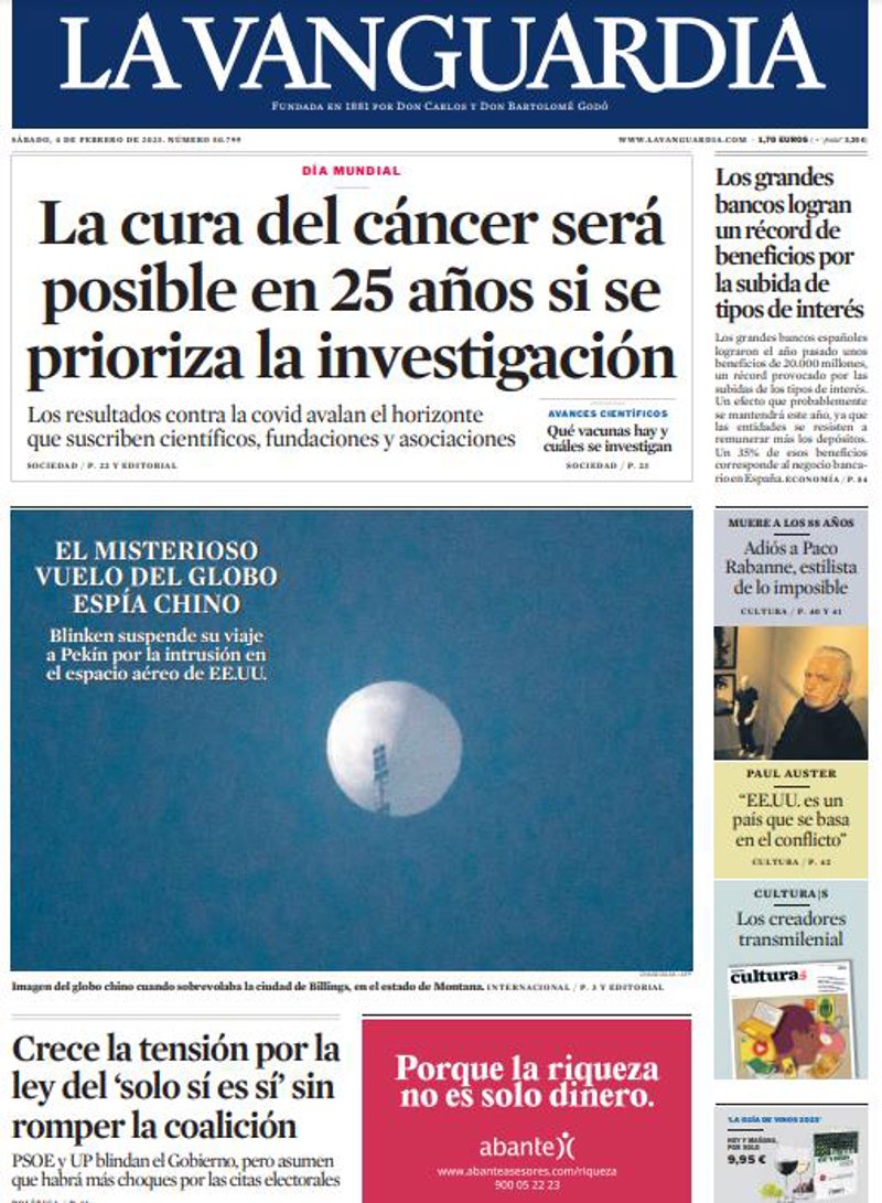 LA VANGUARDIA: "La cura del cáncer será posible en 25 años si se prioriza la investigación"; "Crece la tensión por la ley del 'solo sí es sí' sin romper la coalición"; "Los grandes bancos logran unrécord de beneficios por la subida de tipos de interés".
