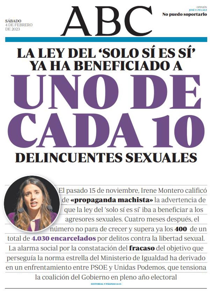 ABC: "La ley del 'solo sí es sí' ya ha beneficiado a uno de cada 10 delincuentes sexuales".