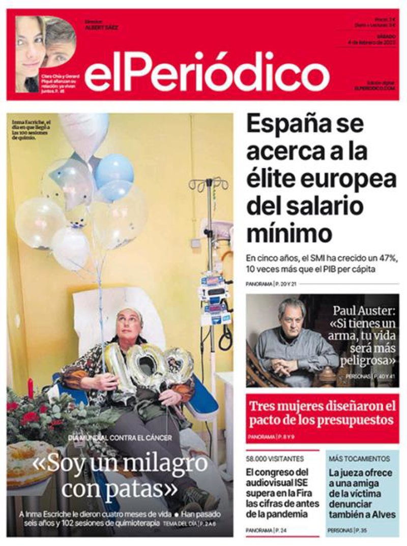 EL PERIÓDICO: "España se acerca a la élite europea del salario mínimo"; ""Soy un milagro con patas""; "Paul Auster: "Si tienes un arma, tu vida será más peligrosa""; "Tres mujeres diseñaron el pacto de los presupuestos"; "El congreso audiovisual ISE supera en la Fira las cifras de antes de la pandemia"; "La jueza ofrece a una amiga de la víctima denunciar también a Alves".