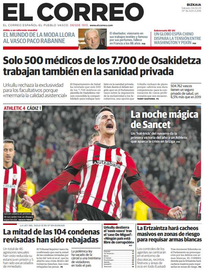 EL CORREO: "Solo 500 médicos de los 7.700 de Osakidetza trabajan también en la sanidad privada"; "La mitad de los 104 condenas revisadas han sido rebajadas"; "Urkullu destierra el 'oasis vasco' tras el 'caso De Miguel': "Ningún país está libre de corrupción""; "La Ertzaintza hará cacheos masivos en zonas de riesgo para requisar armas blancas".