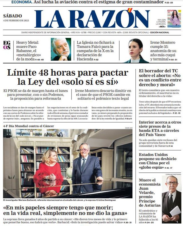 LA RAZÓN: "Límite 48 horas para pactar la Ley del "solo sí es sí""; ""En mis papeles siempre tengo que morir; en la vida real, simplemente no me dio la gana""; "El borrador del TC sobre el aborto: "No es un conflicto entre derecho y moral""; "Interior acerca a otros siete presos de la banda ETA a cárceles del País Vasco"; "Estados Unidos pospone su deshielo con China por el "globo espía""; "Muere el economista Juan Velarde, premio Príncipe de Asturias".