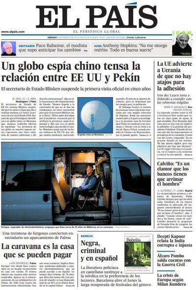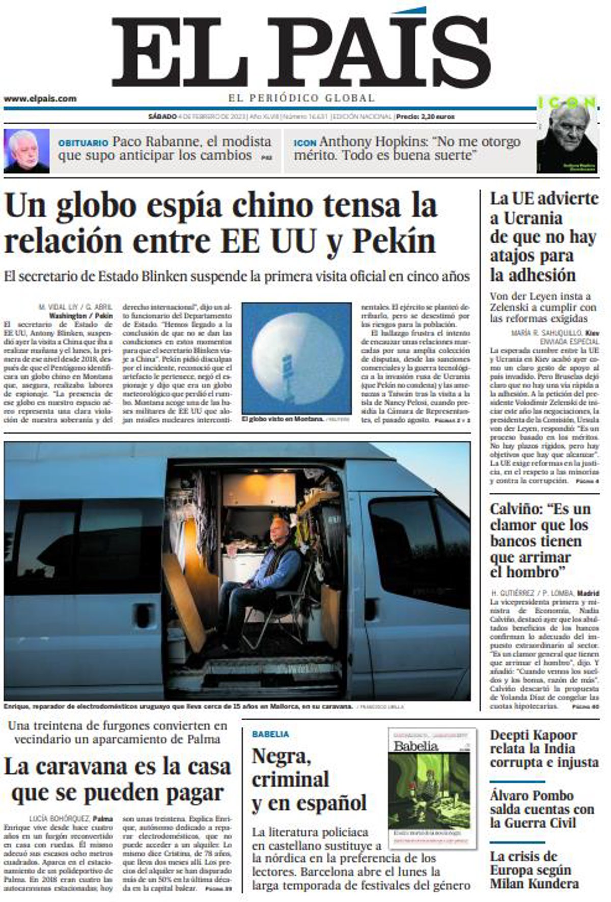 EL PAÍS: "Un globo espía chino tensa la relación entre EE UU y Pekín"; "La caravana es la casa que se pueden pagar"; "La UE advierte a Ucrania de que no hay atajos para la adhesión"; "Calviño: "Es un clamor que los bancos tienen que arrimar el hombro"".
