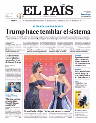 EL PAÍS: "Trump hace temblar el sistema": "Aitana Sánchez-Gijón: 'No hay que temer a la cultura'"; "La ultraderecha europea llama a aprovechar la ola de Donald Trump"; "Óscar López, secretario general del PSOE madrileño: 'Hay una mayoría progresista en Madrid. Hay que movilizarla'"; "España sorprende a los expertos por su crecimiento: de oveja negra a motor europeo"; "Beber alcohol ya no está de moda. La generación Z quiere ser abstemia".